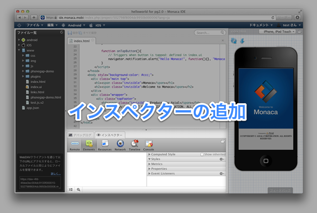 Monaca新機能リリース。インスペクター追加、PhoneGap2.0対応、Monacaデバッガ改善、WebDAVのWindows対応。