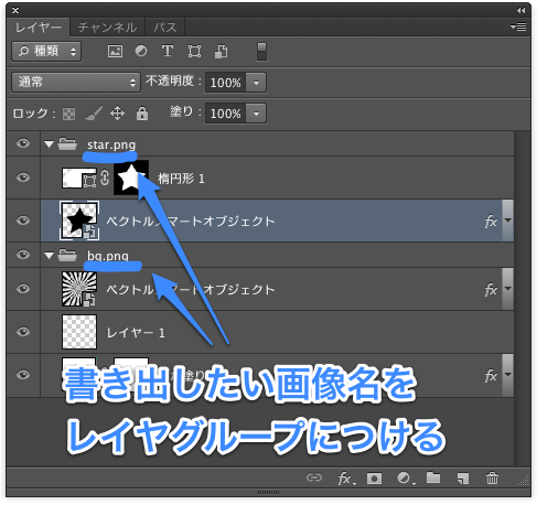 以下の画像の場合、星の画像と背景を別々に書き出したいので、対応するレイヤグループにbg.pngとstar.pngという名前をつけます。