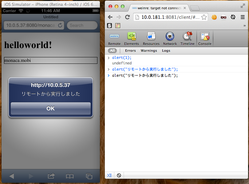 図. PCから、スマホブラウザ内でJSを実行してみた例