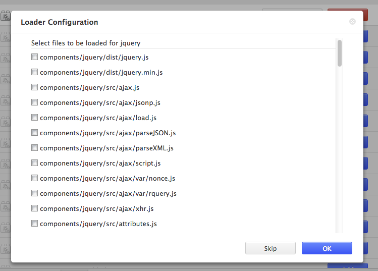 しかしながら、BowerライブラリからjQueryを組み込む場合は、loader.jsに入れるかどうかは、ユーザーが自分で決定することが出来ます。操作の流れとしては、まず、JS/CSS Componentsの画面の検索ボックスからjqueryで検索を行い、検索結果から組み込みたいコンポーネントを選択します。