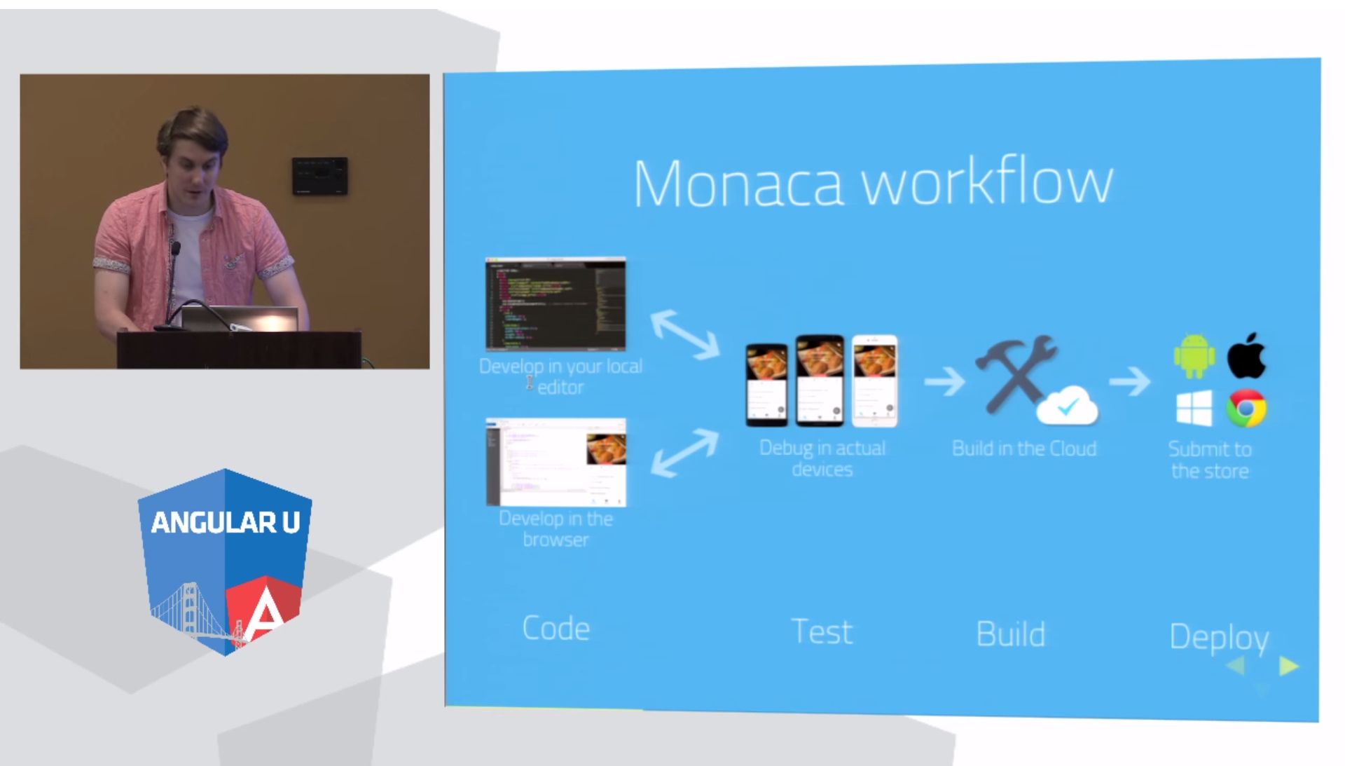 コーディングはローカルのエディタ、またはCloud IDEを使ってブラウザ上での開発が選択できます。テストはMonacaデバッガーを使って行います。コードを編集すると自動的に同期する仕組みになっています。
