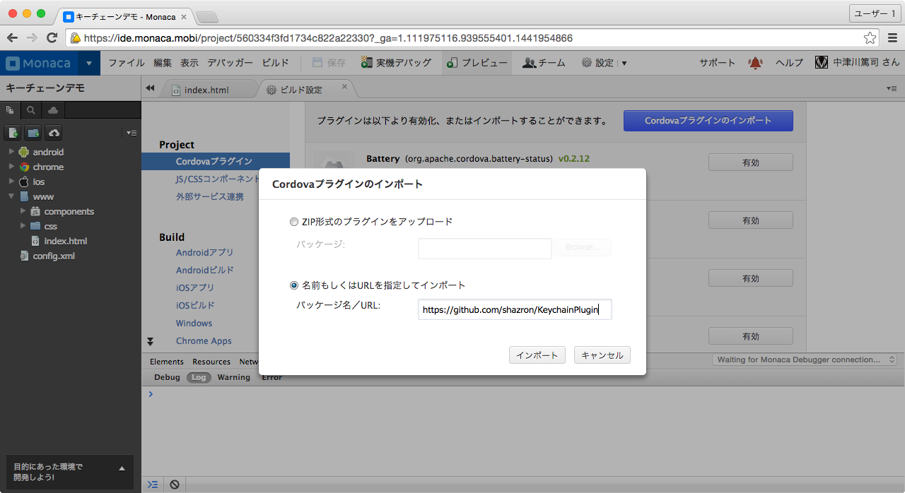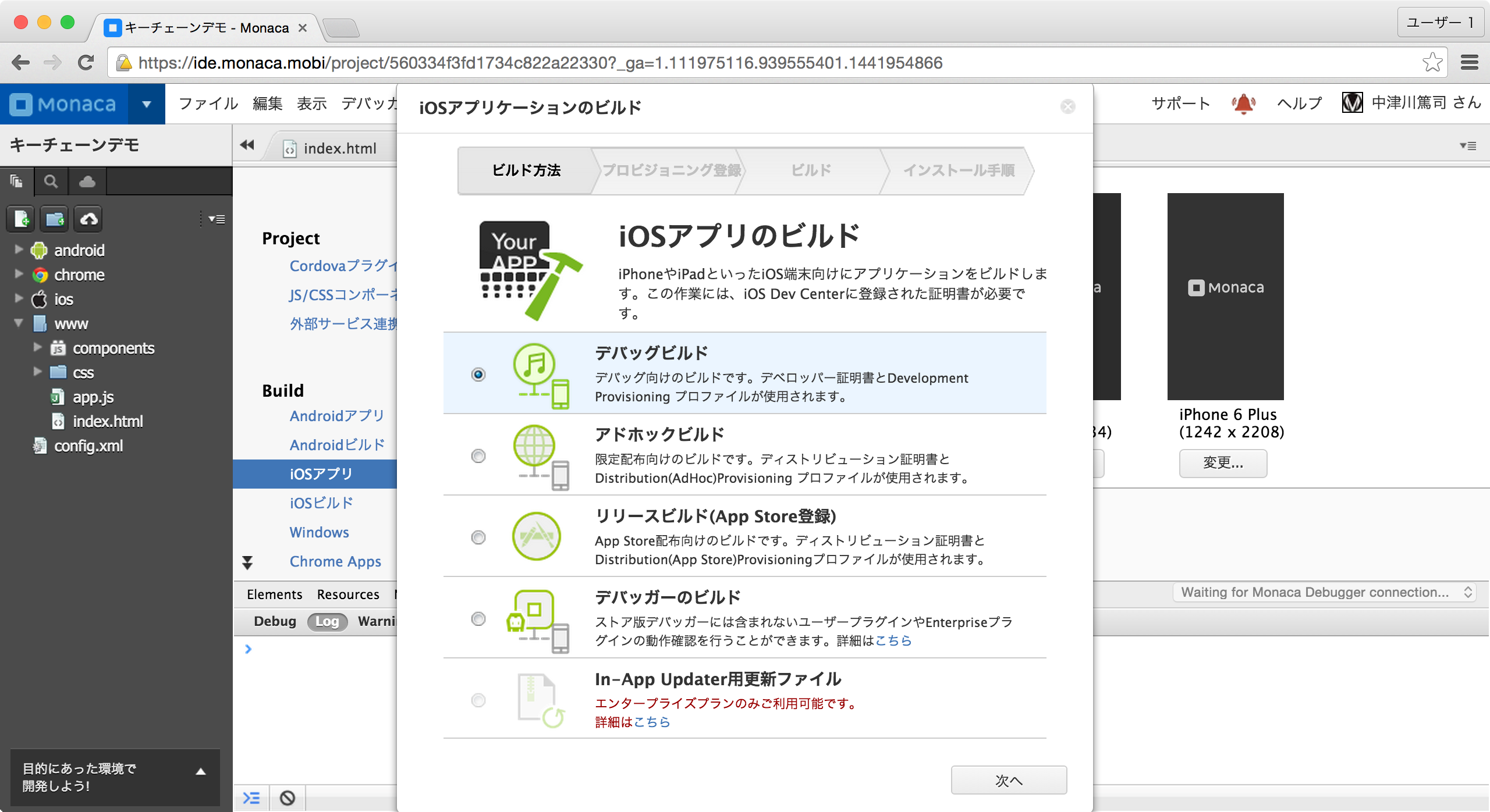 インストールしたらiOSアプリ設定、ビルド設定を行います。任意のプラグインを使った場合、Monacaデバッガーではなくアプリとしてビルドとインストールをしなければなりません。ビルド設定時にはあらかじめ作成した開発者証明書などをアップロードしてください。