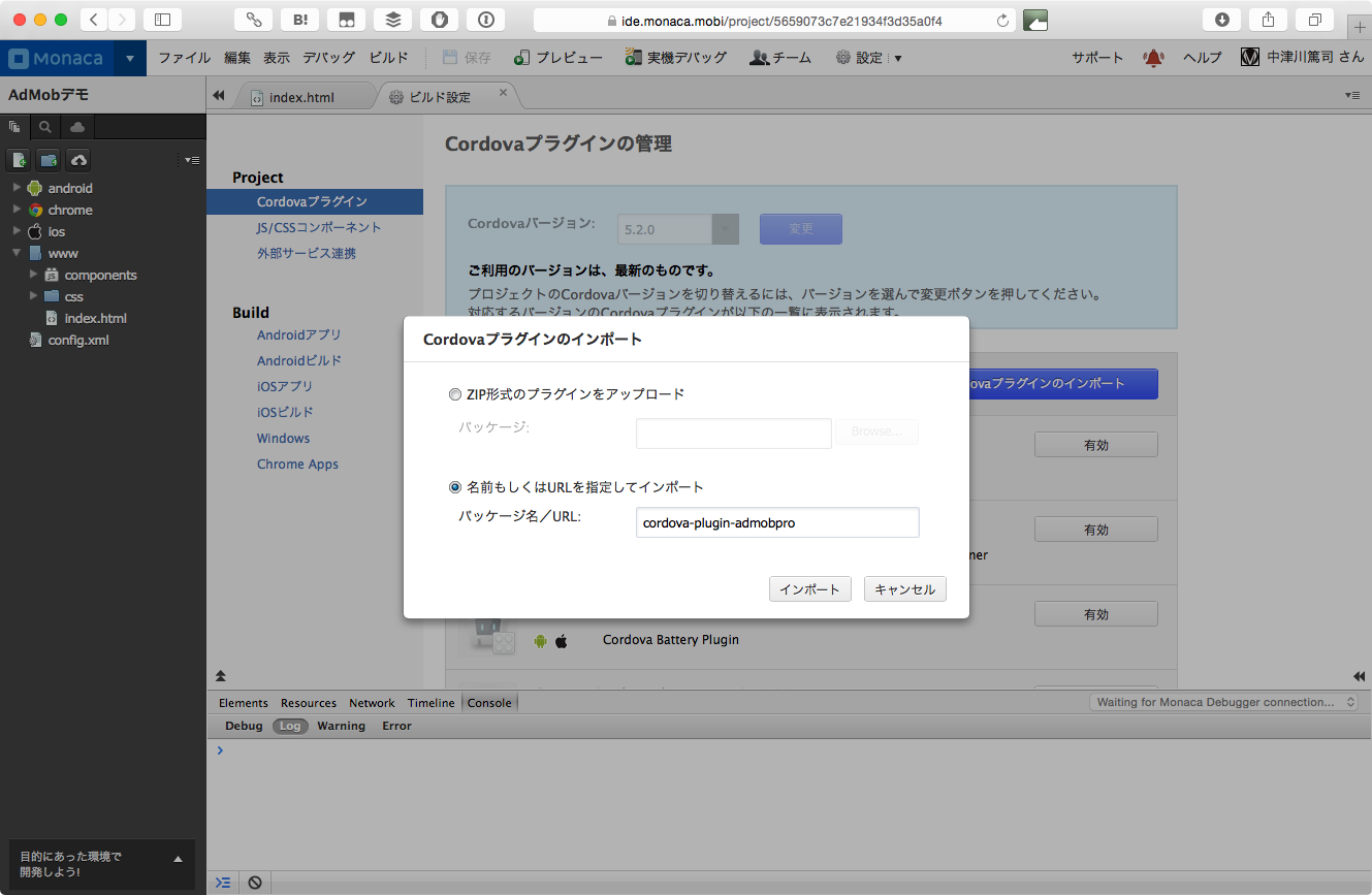 設定メニューからCordovaプラグインの管理を選択して、cordova-admob-proをインストールします。