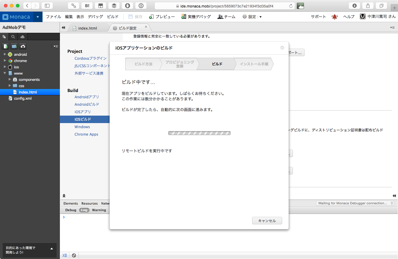 独自のプラグインを使っていますので、アプリストア配布のMonacaデバッガーではデバッグできません。デバッグビルドなど、ビルドした上でアプリを実機にインストールして確認してください。