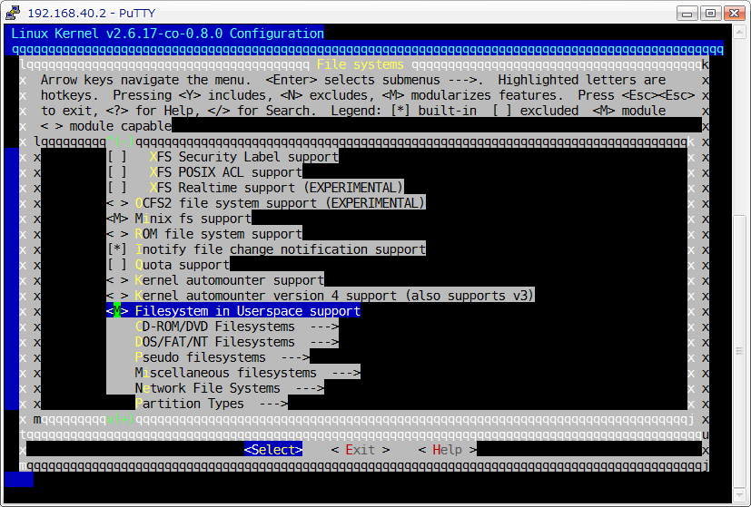 で、「File systems」の項目の「Filesystem in Userspace support」を「m」にします。次にMakefileに記述されているEXTRAVERSIONの部分を下記のように変更します。