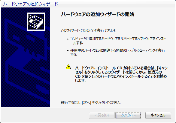 「コントロールパネル」の「ハードウェアの追加」をクリックし「ハードウェアの追加ウィザード」に沿ってインストールを進めていきます。