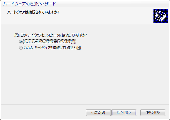 次へをクリックししばらく待つと”ハードウェアは接続されていますか?”という画面に変わるので、そこで”はい、ハードウェアを接続しています”を選び次ぎへをクリックします。