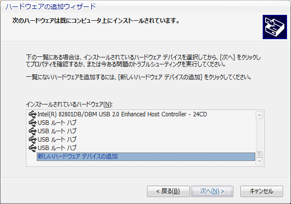 すると”次のハードウェアは既にコンピュータ上にインストールされています。”という画面に変わるので、リストの一番下にある”新しいハードウェア デバイスの追加”をクリックし次へをクリックします。