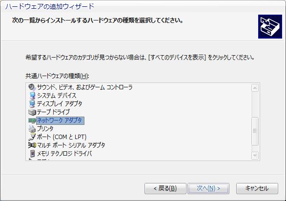 ”次の一覧からインストールするハードウェアの種類を選択してください。”という画面になるので、そこで”ネットワーク アダプタ”を選択し次へをクリックします。