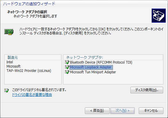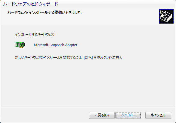 しばらくすると”ネットワーク アダプタの選択”という画面になるので”製造元”から”Microsoft"、”ネットワーク アダプタ”から”Microsoft Loopback Adapter"を選択し、次へをクリックします。