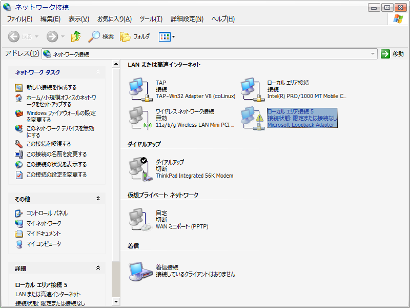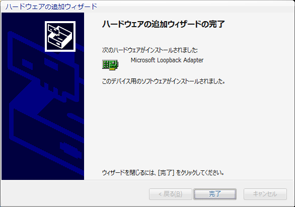 以上でMicrosoft Loopback Adapterのインストールは完了です。「ネットワーク接続」を開くとインストールしたアダプタを用いた接続が出来ていると思うので、次にこのアダプタの設定を行います。この接続の名前はわかりやすいように変更しておくと良いかもしれません。