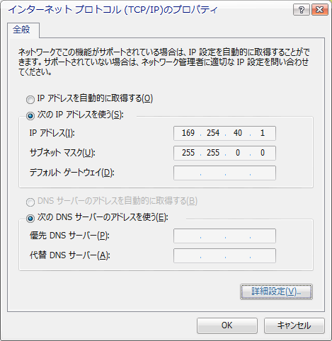 このアダプタを右クリックし「プロパティ」を開いて”インターネット プロトコル(TCP/IP)”のプロパティでIPアドレスの設定します。このアドレスは他のPCと重ならないように気をつけて好みで設定してください。この例では169.254.40.1としています。