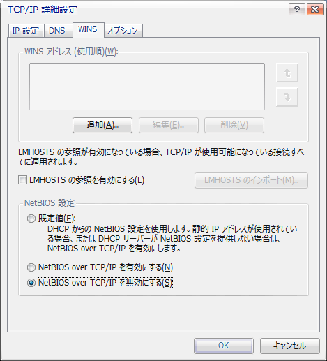また、「詳細設定」をクリックし「WINS」のNetBIOSの設定を”NetBIOS over TCP/IPを無効にする”を選択しOKをクリックしてください。