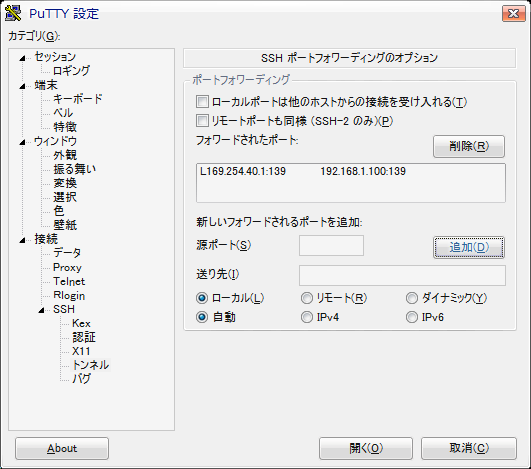 これでアダプタの設定は完了です。あとはPuTTYを使ってポートフォワードするだけです。PuTTYの”SSHポートフォワーディングのオプション”を開き、「源ポート」にはMicrosoft Loopback AdapterのIPアドレス:ポートを入力します。先ほどの設定で行った例を使うと、169.254.40.1:139と入力します。また「送り先」にはSSHで繋いだ先にあるSambaサーバのアドレス:ポートを入力します。この例だと192.168.1.100:139と入力し追加をクリックします。これで開くをクリックし接続します。