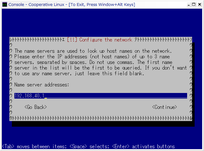 ここでContinueを選択して次の画面でConfigure network manuallyを選択してIPアドレスを手動で入力します。先のTAPの設定でTAPのIPアドレスを192.168.40.1に設定しているので、coLinuxには192.168.40.2を割り当ています。