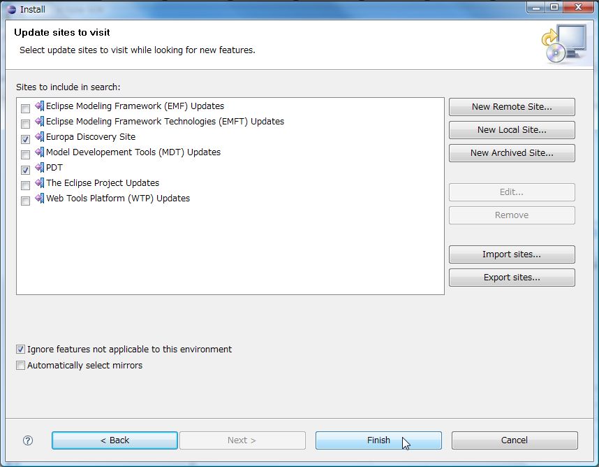 追加したら[Finish]をクリックし進めていきます。Update Site Mirrorsというダイアログが出るので近いミラーを選びます。しばらくするとインストールするプラグインの選択画面が表示されるのでEuropa Discovery Siteの中のDatabase Development、Models and Model Development、Web and JEE Developmentにチェックをつけて、追加したPDTにもチェックをつけて[Next]をクリックし画面の指示通り進めていきます。