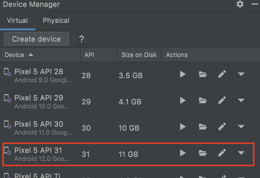 Android Studioをインストールし、エミュレータを1つ起動できる状態にしておきます。