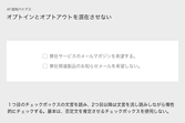 - オプトアウト方式:拒否の意思表示をしてもらう(チェックを入れなければ同意とみなす)