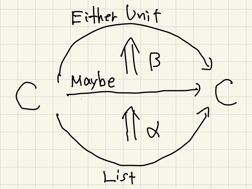 HaskellやScalaなど圏論をもとにしたプログラミング言語はいくつかありますが、そこまでメジャーではないので、ここでは簡単に自然変換について述べてみます。自然変換は、プログラミングで言うところの、ある「型a」を受け取って、その「型a」のList値を受け取って、「型a」のMaybe値を返すような関数αのことです。(Maybe型というのは、JavaでいうOptional型です)