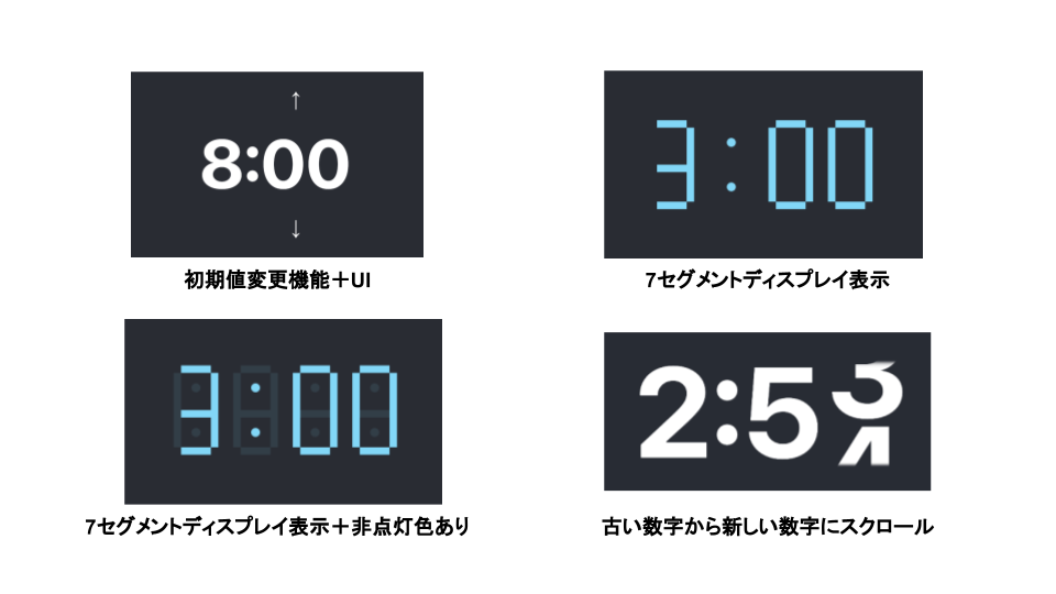 - タイマー表示が「0:00」になった時にタイマー表示が点滅する。
