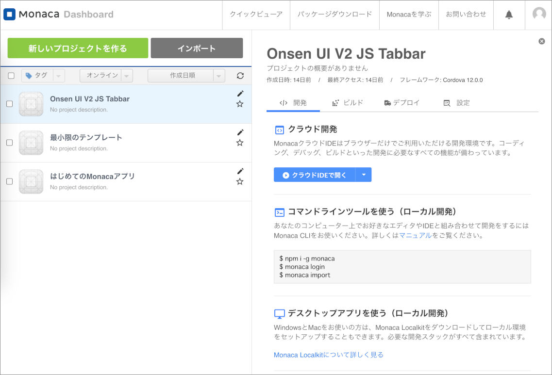 MonacaクラウドIDEにログインすると最初に表示される画面がMonaca Dashboardになります。