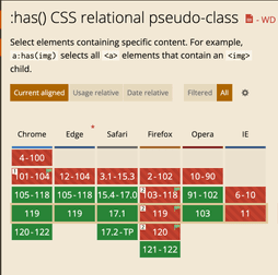 :has() CSS relational pseudo-class | Can I use... Support tables for HTML5, CSS3, etc