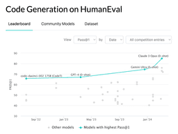 2024年4月18日現在、この HumanEval の問題を「Pass@1 (一発正解)」かつ「0-shot(ヒントなし)」という条件で最も多く解けているのは、Claude 3 Opus というAIモデルで、84.9 % の正答率を記録しています。GPT-4 は 76.5 % の正答率、Gemini Ultra 1.0 は 74.4 % の正答率を記録しています。