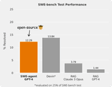 2024年4月2日に公開された SWE-agent は GPT-4 と組み合わせることで 2294 個の問題のうちの 12.29 %