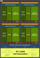 以下は GeForce RTX 4090 の中に 128 個入っている Streaming Multiprocessor (SM) の拡大図です。「FP32/INT32」「FP32」などと書いてある部分が CUDA コアの集まりに相当します。