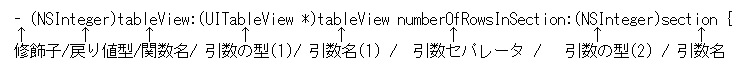 上記の tableView:numberOfRowsInSection:というメソッドは、UITableViewControllerで定義されているメソッドで、戻り値が1つのテーブルで扱われるセルの数になります。