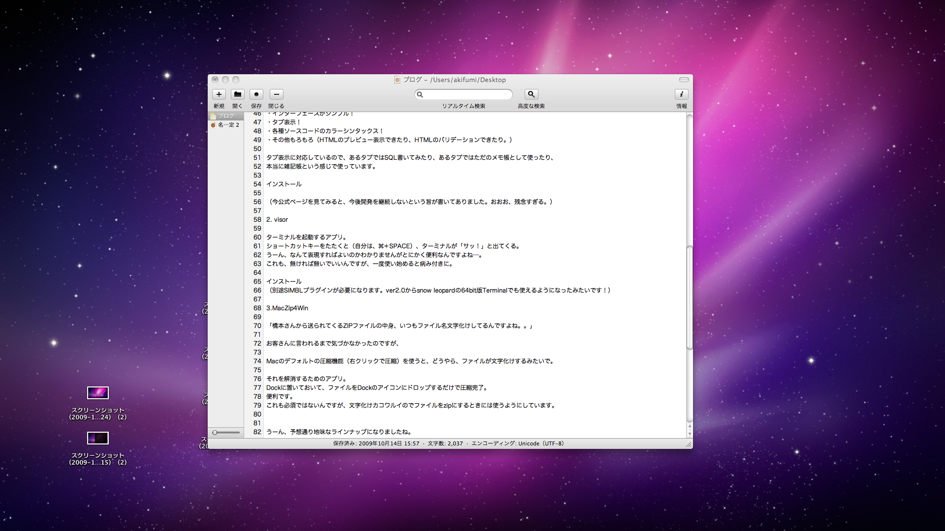 ・iWork'09 …Excelファイルを開くときに、ち ょっと前まで「NeoOffice」使っていたんですが、最近はすっかりNumbersを使うようになりました。見た目キレイなんですもん。Pagesはアウトライナーとして使ってます。プレゼン資料はKeynote一択。