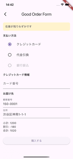 例として、以下のようなECアプリの注文フォーム画面仕様を(ChatGPTに手伝ってもらいながら)考えました。
