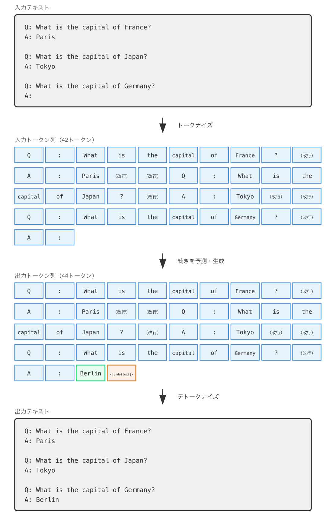 言語モデルはテキストを トークン (token) という単位に分割して処理します。トークンは必ずしも単語と一致するわけではなく、単語の一部分や文字、バイト列の場合もあります。