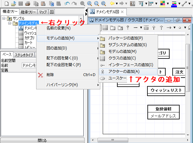 ちなみに、アクタを図に追加するためには、ツリーからフォルダを右クリックし、「モデルの追加→アクタの追加」をクリックします。