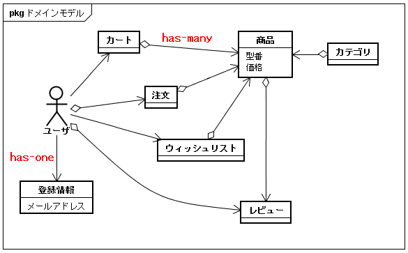 ● 抽象度の高いクラスモデルであるため、ER図のようなデータ中心の図と違い、DBに存在しないモデルまで表現できる。例えばショッピングカートのようなセッション内のオブジェクトなど。